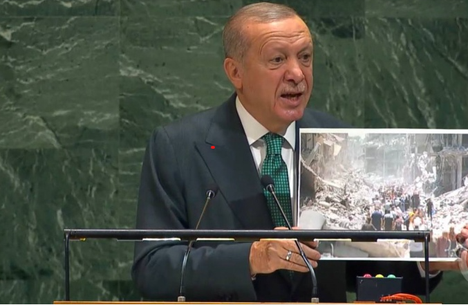 قال الرئيس التركي رجب طيب أردوغان أمام الجمعية العامة للأمم المتحدة "أعرب عن أسفي لغياب رئيس دولة فلسطين عن هذا الاجتماع".