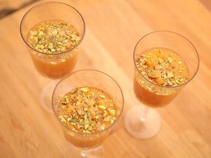 مقادير الوصفة خليط قمر الدين 2 كوب شراب قمر الدين 2 ملعقة كبيرة نشا 2 ملعقة كبيرة سكر 1/2 كوب مشمش مجفف مفروم خليط الكنافة 250 جرام كنافة 1/4 كوب سمن 1/2 كوب شيرة / قطر طريقة التحضير 1. أحضري كاسات زجاجية. 2. باستعمال سكين افرمي الكنافة فرما ناعما. 3. في قدر متوسط الحجم سخني السمن، أضيفي الكنافة، باستعمال ملعقتين خشبية قلبي الكنافة باستمرار إلى أن تصبح ذهبية اللون. 4. أضيفي الشيرة على الكنافة وقلبيها لتتشرب تماما 5. خليط قمر الدين: في قدر متوسط الحجم ضعي شراب قمر الدين، السكر والنشا، باستعمال مضرب شبك يدوي قلبي ليذوب النشا، ضعي القدر على نار متوسطة وباستعمال ملعقة خشبية قلبي إلى أن يغلي. 6. باستعمال ملعقة وزعي الكنافة في الكاسات بالتساوي واضغطي عليها بخفة لتصبح كطبقة في القاع. 7. وزعي المشمش على الكنافة في الكاسات. 8. وزعي شراب قمر الدين في الكاسات 9. وزعي قليل من الكنافة على سطح قمر الدين 10. ضعي الكاسات في البراد لتبرد تماما. 11. زيني بالفستق الحلبي والمشمش المجفف، قدميها بارد