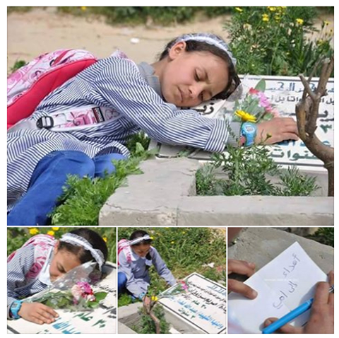 يذكر أن وسائل الإعلام تناقلت صوراً للطفلة آلاء في عيد الأم وهي تحتضن قبر أمها الشهيدة, وعبر كثيرون عن مؤازرتهم للطفلة وواقعها المأساوي.