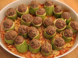 المقادير: 6 حبة كبيرة كوسى 500 جرام كفتة 0.25 كوب معجون طماطم 2 كوب مرق 2 ملعقة كبيرة عصير ليمون 1/2 ملعقة صغيرة فلفل اسود 1 ملعقة صغيرة ملح 1 ملعقة صغيرة بهار مشكل 2 ملعقة كبيرة زيت زيتون طريقة التحضير 1. سخني الفرن لدرجة حرارة 180م، أحضري طبق فرن متوسط الحجم. 2. اغسلي الكوسى، باستعمال سكين تخلصي من الجزء العلوي والسفلي لحبات الكوسى. 3. قطعي حبات الكوسى بالعرض إلى قطع مقاس 4 سنتيمتر. 4. باستعمال ملعقة صغيرة فرغي قطع الكوسى قليلا، واحتفظي بلب الكوسى. 5. ضعي لب الكوسى في طبق الفرن على شكل طبقة. 6. رصي قطع الكوسى في الطبق بحيث يكون الجزء المفرغ إلى أعلى 7. شكلي الكفتة إلى كرات بحجم الجزء المفرغ بقطع الكوسى 8. ضعي الكفتة في قطع الكوسى. 9. في طبق عميق ضعي المرق، عصير الليمون، الفلفل الأسود، الملح، البهار وزيت الزيتون 10. باستعمال ملعقة قلبي المكونات لتختلط جيدا، وزعيها في الطبق. 11. ادخلي الطبق إلى الفرن لمدة ساعة إلى أن تنضج الكفتة. 12. أخرجي الطبق من الفرن، وزعي الصنوبروقدميه