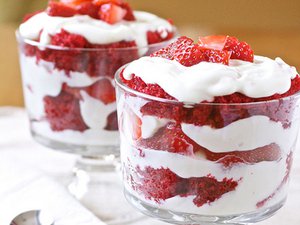 المكونات: -225 جرام جبن كريم، بارد  -23 كوب زبادي خالي من الدسم أو الزبادي اليوناني  - ملعقة صغيرة عسل - ملعقة صغيرة قشر الليمون  -2 ملعقة صغيرة  الفانيليا  -2 كوب من السكر البودرة، منخول -2 ملعقة صغيرة من القشطة  - 4 إلى 6 قطع كعكة مخملية حمراء - 1 ونصف كوب إلى 2 كوب من الفراولة الطازجة، مقشر ومقطع شرائح حوالي 1/4 بوصة    طريقة التحضير: -في وعاء الخفق ضعي كل من الجبن، العسل، الزبادي، الليمون والفانيليا واخفقيه بسرعة متوسطة حتى يمتزج جيداً حوالي ٣ إلى ٤ دقائق. -أضيفي السكر للخليط السابق تدريجياً ثم أضيفي القشطة. -في أطباق التقديم ضعي القليل من خليط الجبن. -فتتي قطع الكعك وضعيه على الخليط. -غطي فتات الكعك بخليط الجبن مجدادً. -أضيفي قطع من الفراولة.   -أعيدي تكرار العملية حتى تنتهي مع طبقة من كريمة الجبن المزينة بالفراولة. -غطي الطبق جيداً وادخليه الثلاجة حوالي ٨ ساعات أو طوال الليل وقدميه بارداً.