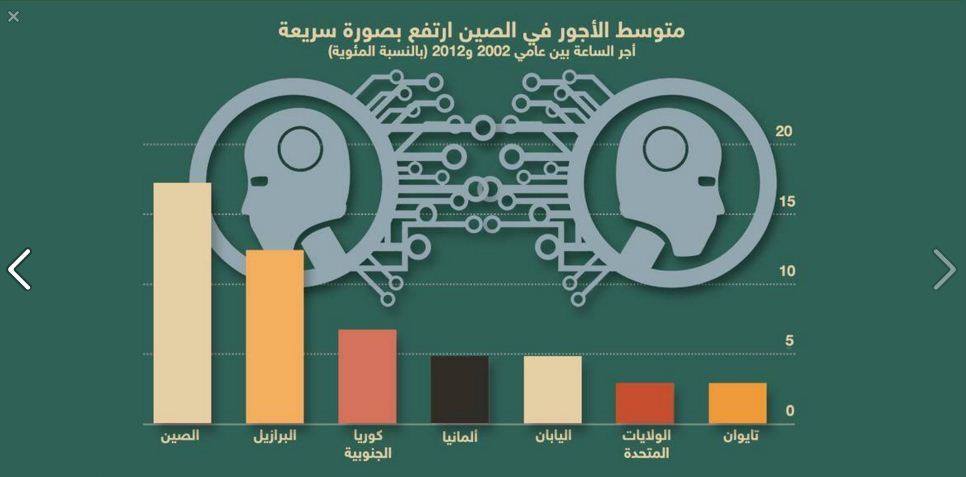 وكما يظهر من الرسوم البيانية المرافقة، أن عدد الروبوتات العاملة في الصين عام 2013، يشكل نحو 30 في المئة من عددها في أميركا الشمالية و11 في المئة من عددها في ألمانيا و9 في المئة منها في اليابان و7 في المئة منها في كوريا الجنوبية.