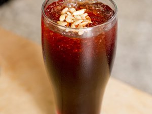 أسكبي شراب الجلاب اللايت في أكواب التقديم وزيّنيها بالصنوبر.