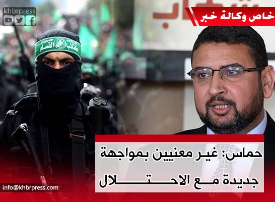 صرح الناطق الرسمي باسم حركة حماس سامي أبو زهري، أن حركته ليست معنية في اندلاع مواجهة جديدة، أو إعلان تصعيد من قبل كتائب القسام، مؤكداً على أن موقف الحركة مرتبط بطبيعة السلوك الإسرائيلي تجاه الشعب الفلسطيني، حيث أن الاحتلال يدرك أن حماس تدير الأمور بحكمة شديدة، وأنها على أتم الجاهزية للدفاع عن فلسطين من الخطر الإسرائيلي.