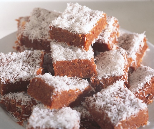 يقطع محتوى الصينية إلى مربعات ويرش فوقها المزيد من جوز الهند.