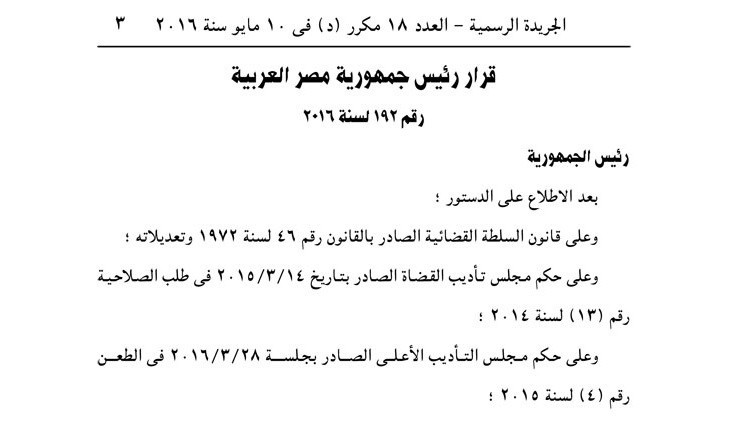 ونشرت الجريدة الرسمية قرار العزل، حيث قالت إن السيسي أصدر القرارين الجمهوريين 192 و193 لسنة 2016 بإحالة بعض القضاة إلى التقاعد أو العزل، وذلك بعد حكمي مجلس تأديب القضاة بإدانتهم، الصادرين في 14 و28 مارس/آذار الماضي، في القضيتين المعروفتين إعلاميا بـ"قضاة من أجل مصر" و"بيان رابعة".