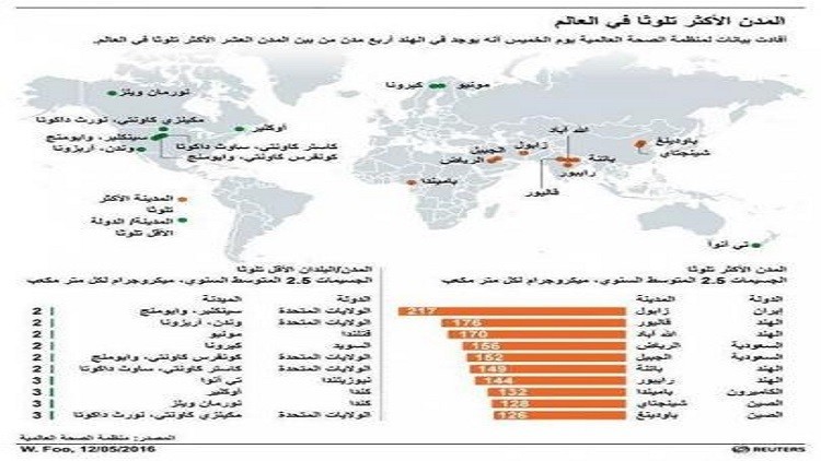 وحسب منظمة الصحة الخميس 12 مايو/أيار، سجل أسوأ معدل تلوث في مدينة زابل الإيرانية التي تعاني عواصف ترابية على مدى شهور في الصيف بينما جاءت مدينتا جواليور والله أباد بالهند في المركزين الثاني والثالث تلتهما الرياض والجبيل بالسعودية ثم مدينتان هنديتان أخريان هما باتنا ورايبور.