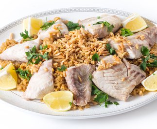 ● في طبق التقديم، ضعي الأرز ثمّ وزّعي فوقه قطع السمك ؛ زيّني بالصنوبر المحمص والبصل المحمّر وقدّمي الطبق ساخناً مع الصلصة.