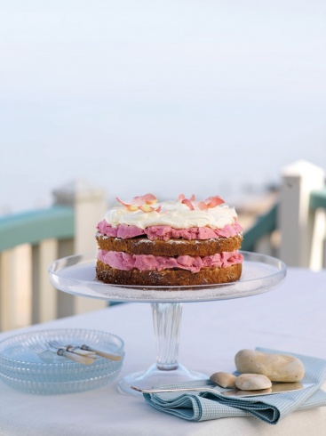 يزين الجاتوه بالكريما وبتلات الورد ويقدم.