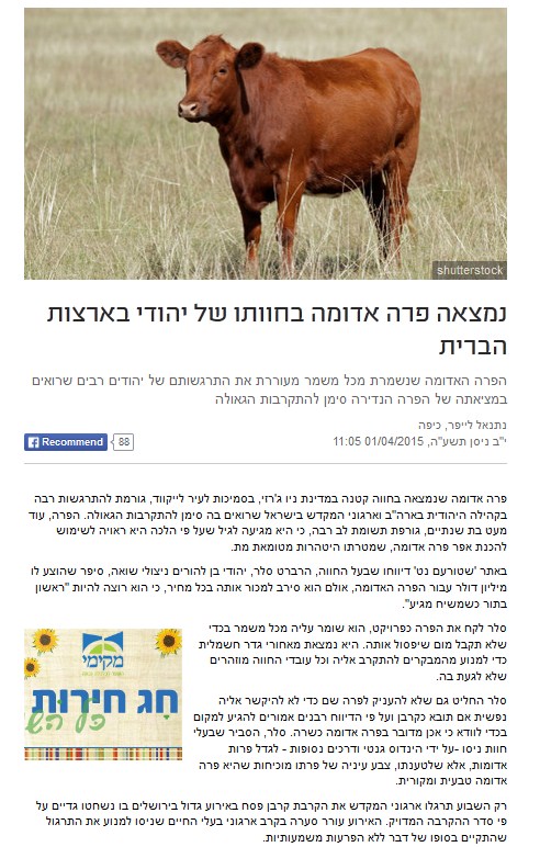 زعم موقع عبري، ظهور بقرة حمراء في مزرعة لدى يهودي أمريكي من سكان ولاية "نيو جيرسي" الأمريكية، يعتقد أنها "البقرة الحمراء" المقدسة المنتظرة لدى اليهود، وأثارت هذه البقرة اهتمام الجاليات اليهودية في الولايات المتحدة الأمريكية.
