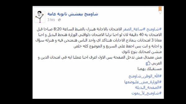 في تحد جديد لوزارة التعليم المصرية ذكرت صفحة "شاومينج بيغشش ثانوية عامة" على موقع التواصل الاجتماعي "فيسبوك" بأنه سيجرى تسريب امتحان اللغة الإنجليزية لطلاب الثانوية العامة، المقرر إجراؤه، صباح اليوم الثلاثاء، قبل موعده بـ45 دقيقة.