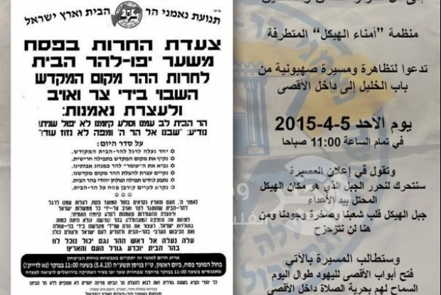 نشرت منظمة "أمناء الهيكل" المزعوم اعلانات تدعو أنصارها للمشاركة في مسيرة تبدأ غدا الأحد من باب الخليل الساعة الحادية عشرة صباحا وحتى باب المغاربة، تمهيدا لاقتحام المسجد الأقصى .