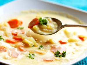 أعيدي الحساء إلى النار ثم اضيفي الكمية المتبقية من الكريمة واتركيه حتى الغليان ثم قدمي الحساء.