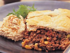 - ضعي خليط اللحمة المفرومة ووزعيه بشكل متساوٍ، ومن ثم عاودي وضع طبقات عجينة الجلاش المتبقية وافصلي بينها بالسمنة أيضاً.