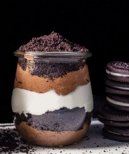 5 – لتجميع الجرار، ضعي طبقة من موس الشيكولاتة، ثم أضيفي الكوكيز المكسرة، ثم القشدة، وكرري الطبقات حتى ينتهي الجرار.