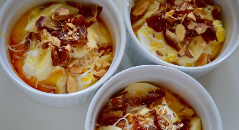 2. ثم نوزع عليها قطع الموز والتمر، ونضيف ملعقة كبيرة من اللوز المفروم إلى كل كوب.