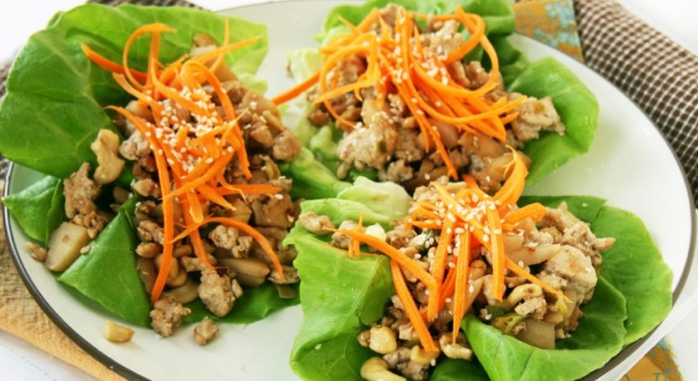 5 – ضعي الدجاج داخل أوراق الخس، ويقدم مع الصلصة.