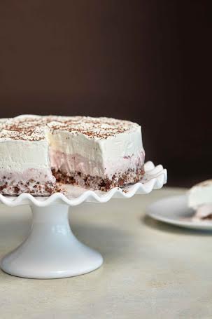 5 – ضعي الوعاء بالكامل في الثلاجة لمدة 3-4 ساعات قبل التقديم، ثم اضيفي الشوكولاتة فوق الكعكة.
