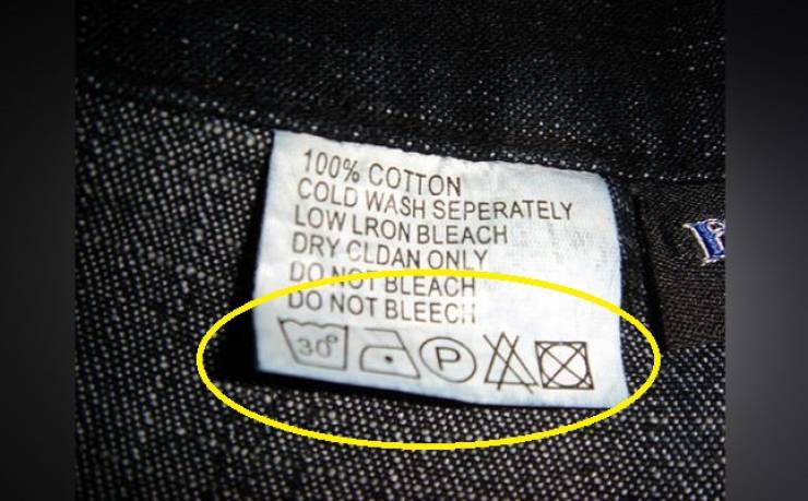 - تعليمات الغسل: اذا اردت ان تعرف كيفية غسل الجينز بالطريقة الصحيحة انظر الى علامة الكوب على هذه الرقعة، على هذا الكوب ستجد رموزاً ترشدك على حرارة المياه المناسبة للغسيل، استعمال اليد او الغسّالة او حتى الامتناع تماماً عن الغسل.
