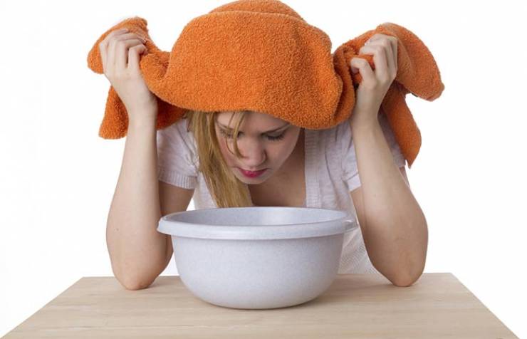 املئي الوعاء بالماء الساخن وأضيفي الزيت العطري المفضل لديك، كزيت شجرة الكينا والليمون وشجرة الشاي، والمسك، جيدين للجيوب الأنفية، ثم قومي بتغطية رأسك بالمنشفة بحيث تصنعين "خيمة" فوق الوعاء، وقومي باستنشاق البخار لمدة 5-8 دقائق بعمق من الأنف، وهذا قد يكون من الصعب القيام به مع انسداد الأنف، لكن البخار سيساعد في تفتيحها.