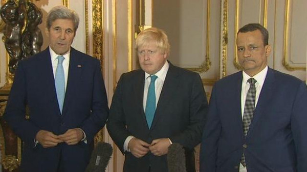 وقال كيري للصحفيين بعد اجتماع مع نظيره البريطاني بوريس جونسون ومسؤولين في لندن "حان الوقت لتطبيق وقف غير مشروط لإطلاق النار ثم التوجه إلى طاولة المفاوضات.. لا حاجة لنا أن نؤكد اليوم على الضرورة الملحة لإنهاء العنف في اليمن".