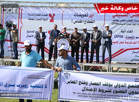 كما عبر القطاع الخاص عن رفضه لآلية إعمار قطاع غزة GRM، في ظل تقليصات كمية دخول الإسمنت التي لا تكفي حجم الإعمار، مطالبين مكتب الأمم المتحدة لخدمة المشاريع UNOPS، بالتوقف فوراً عن إدارة وتعزيز الحصار.