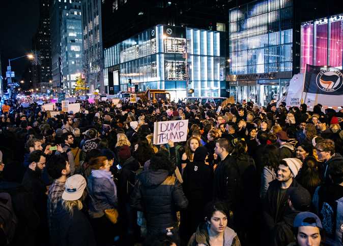 ونزل آلاف المحتجين إلى شوارع وسط مانهاتن للتعبير عن رفضهم ما اعتبروها "مواقف عنصرية ومعادية للأقليات والمسلمين والنساء" أثناء حملة ترامب الانتخابية، فيما هتف مئات تجمعوا في متنزه بوسط المدينة "ليس رئيسي".