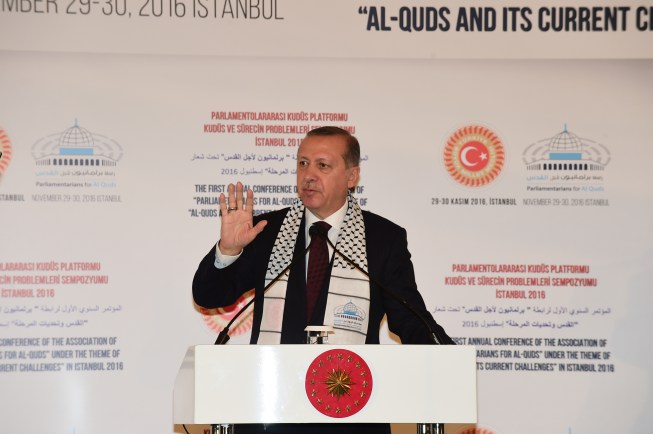 قال الرئيس التركي رجب طيب أردوغان، إن الدفاع عن المسجد الأقصى، ليس مهمة الأطفال الفلسطينيين العزّل الذين لا يملكون سوى الحجارة سلاحًا، إنما تبني القضية الفلسطينية وحماية القدس، هي قضية ومهمّة المسلمين كافة.