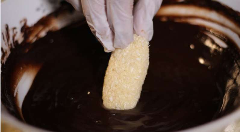7. اغمسي أصابع عجينة جوز الهند في الشوكولاتة الذائبة.