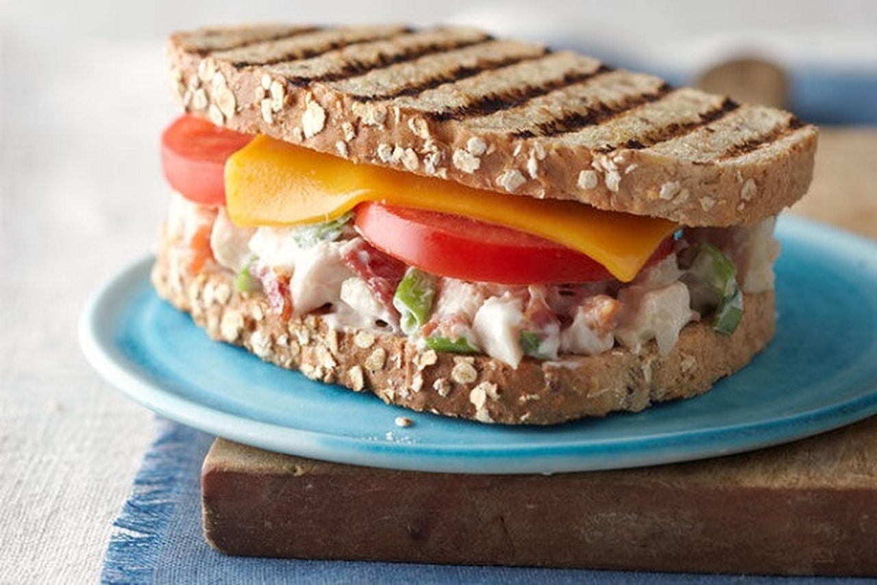 يوضع الخس الشرائح والطماطم على الدجاج المتبل في الساندويتشات ويقدم بالهنا والشفا.