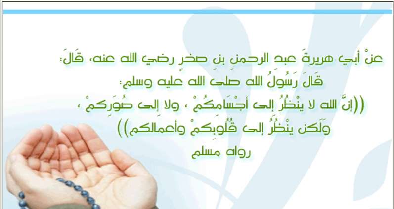 7- وَعَنْ أبي هُريْرة عَبْدِ الرَّحْمن بْنِ صخْرٍ رضي الله عَنْهُ قال : قالَ رَسُولُ الله صَلّى اللهُ عَلَيْهِ وسَلَّم: «إِنَّ الله لا يَنْظُرُ إِلى أَجْسامِكْم ، وَلا إِلى صُوَرِكُمْ ، وَلَكِنْ يَنْظُرُ إِلَى قُلُوبِكُمْ وَأَعمالِكُمْ » رواه مسلم .