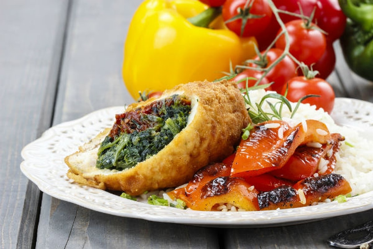 تبلي شرائح الدجاج بالملح والفلفل والبهارات ثم وزعي الحشوة على قطع الدجاج ولفي كل قطعة جيداً.