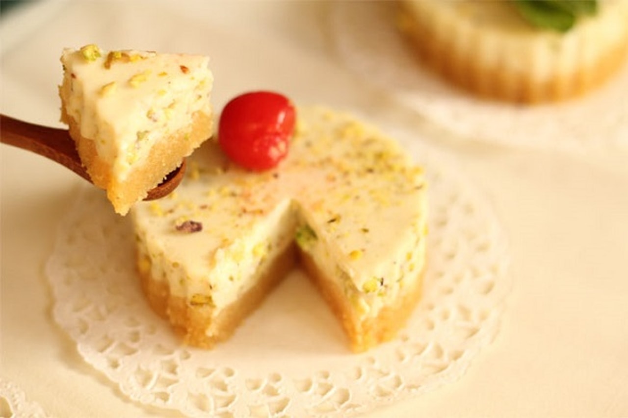 أضيفى القشطة وحركى المزيج جيداً حتى يتجانس. أضيفى الفستق والجيلاتين المذوب وحركى المزيج مرة اخرى.