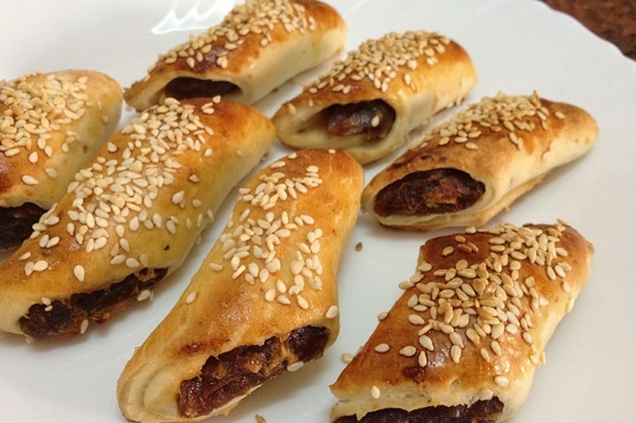 تقطع الأصابع بالحجم المناسب, ويدهن وجهها بالبيض ثم رشي عليها السمسم.
