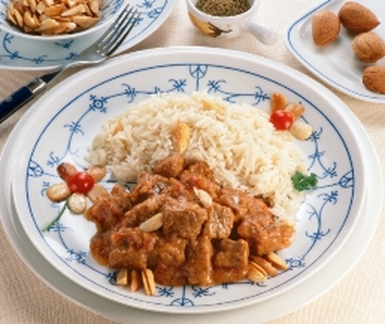 ونضيف الماء ونتركهم على النار حتى النضج ثم نخرج اللحم ونضع الرز فى نفس الماء ونضيف الملح ونتركه حتى يستوى نص سوى ثم نصفيه - ونضع قدر على النارفيه قليل من زيت ونضع البصل ونقلب حتى يذبل ونضيف اللحم ونقلب ثم البهارات الناعمة ماعدا الزعفرات و نقلب بحرص - ونضيف قليلا من الملح ثم نضيف نص الرز ثم نرش الزعفران فوق